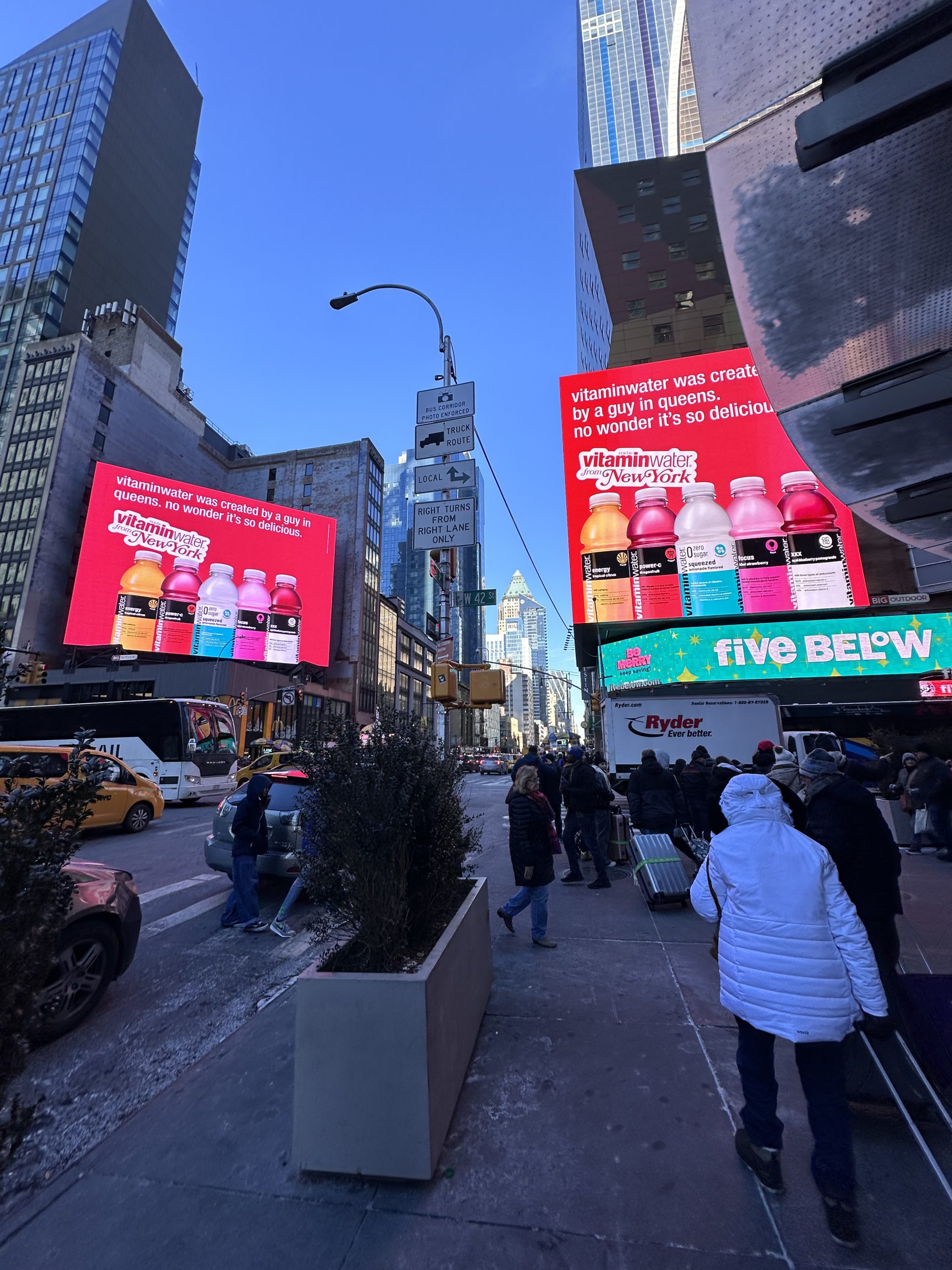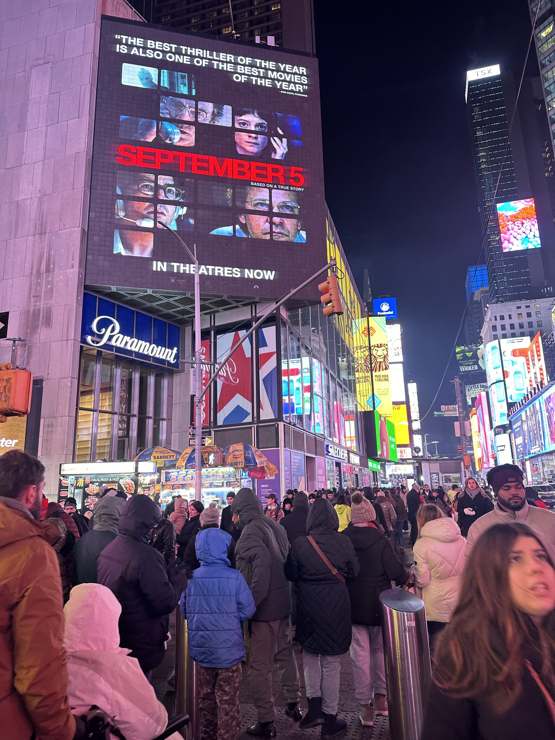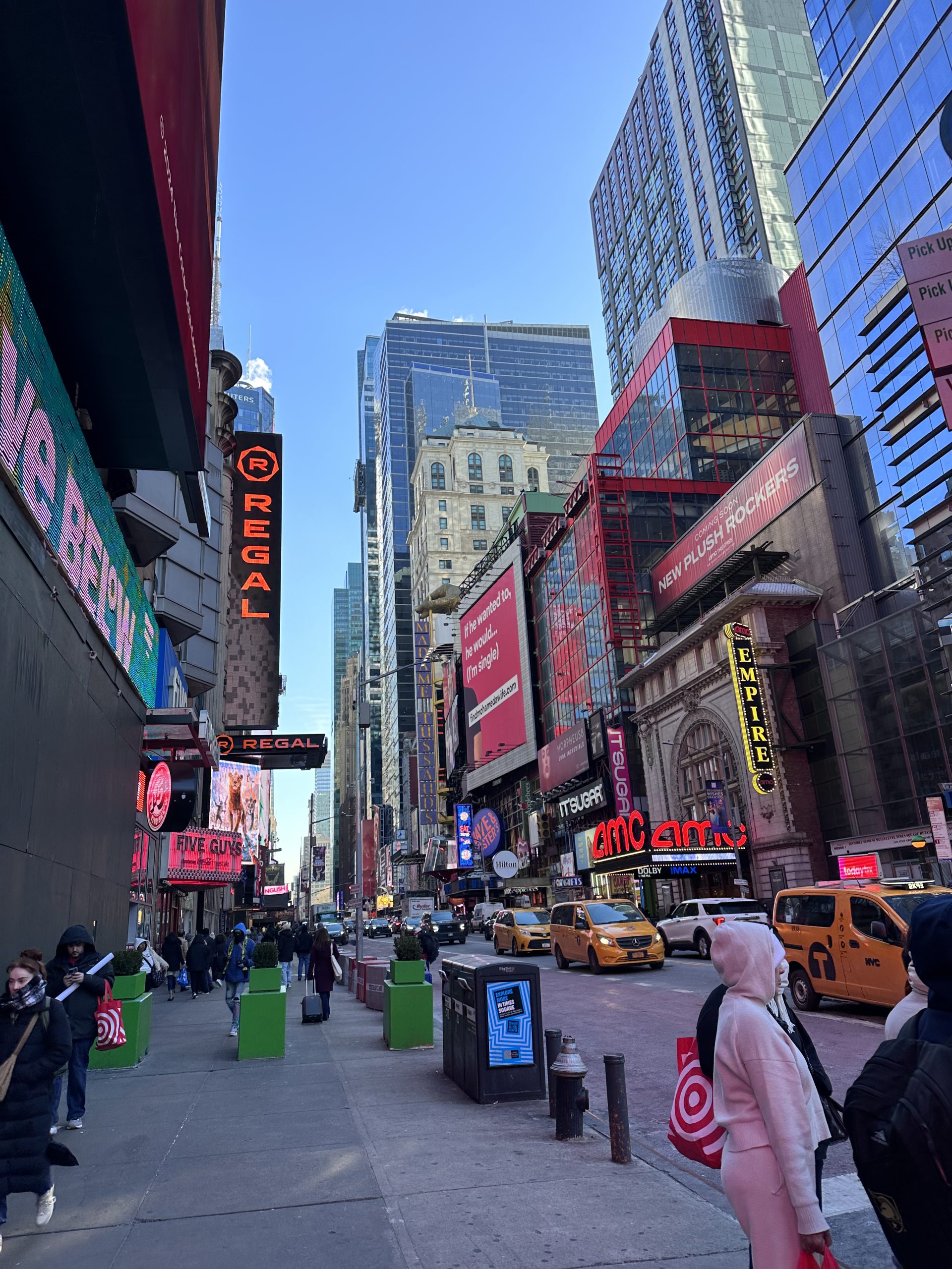 Tu connais, nous connaissons, Times Square endroit mythique où lumières, écrans géants et foule créent une ambiance dynamique 24h/24. Surnommé “le carrefour du monde”, c’est l’un des endroits les plus visités de la planète. En période de fête c’est bondé et magique ! Les décorations, les vitrines des magasins…